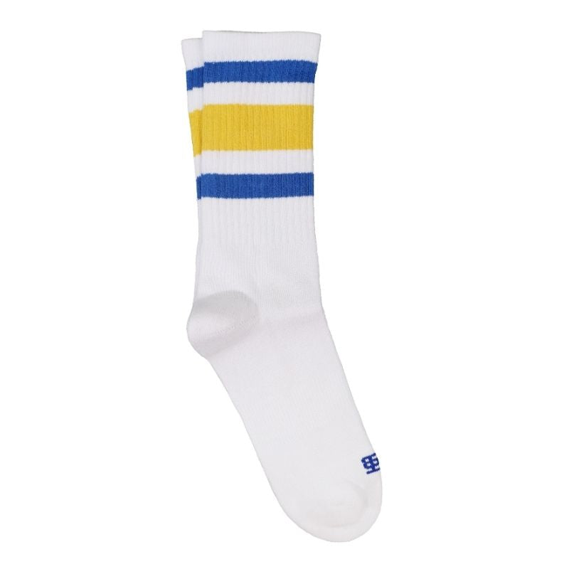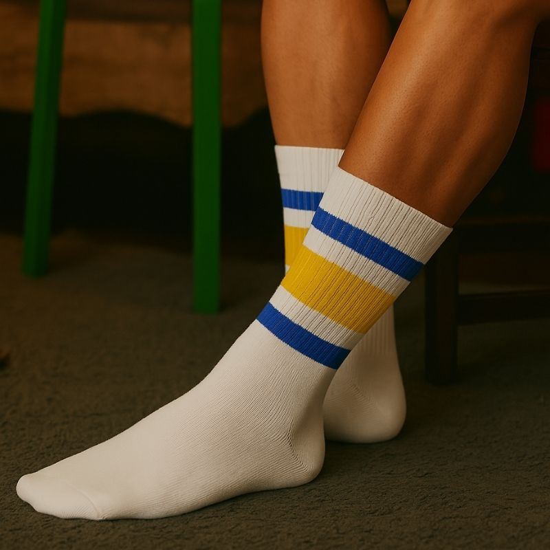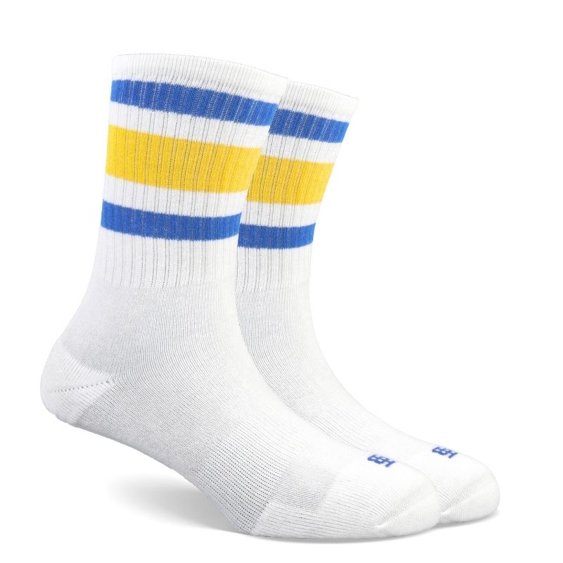 Strike bold with Skybolt – high-performance sports socks for men featuring crisp blue and yellow stripes. Built for breathability, all-day support, and standout style on and off the field.
