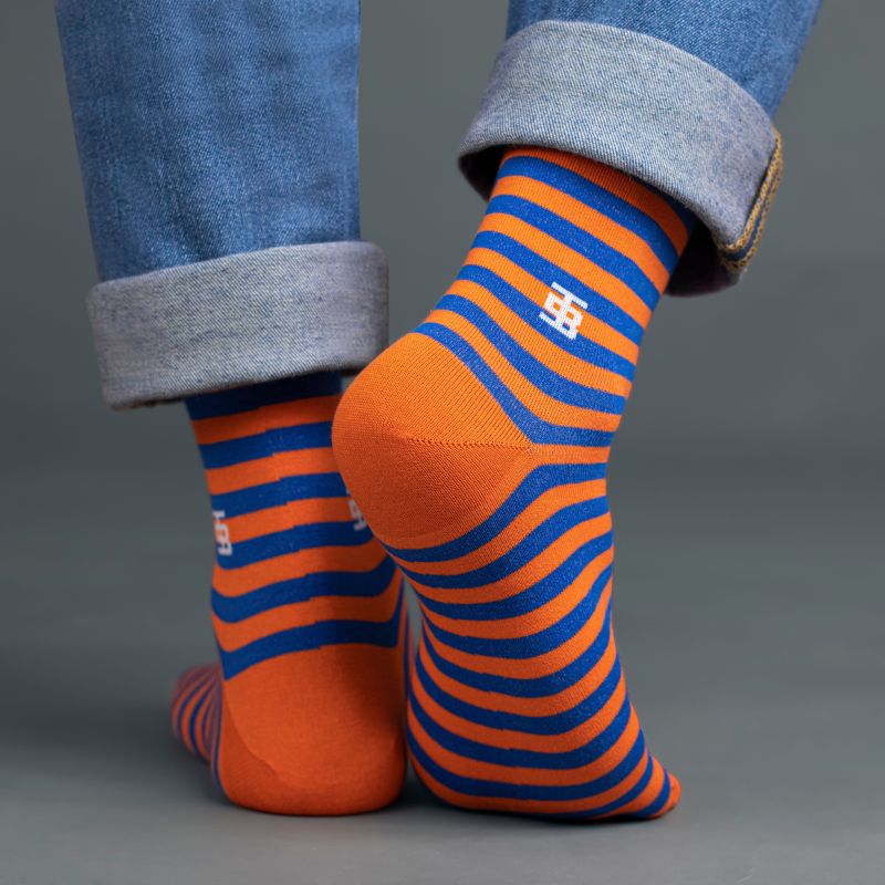 Elevate your sock collection with SockSoho's Sunrise Stripe Edition – a vibrant fusion of bright blue and orange stripes. Immerse your feet in the bold hues of sunrise with these premium designer socks crafted exclusively for men. Walk in style and comfort as you embrace the dynamic energy of Sunrise Stripes, a distinctive addition to SockSoho's sophisticated and trendsetting sock lineup.