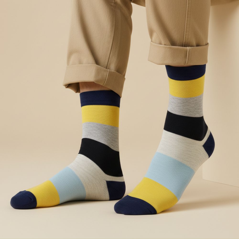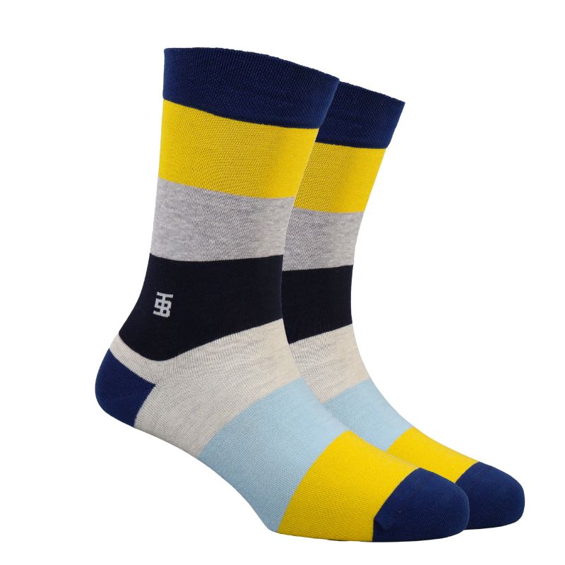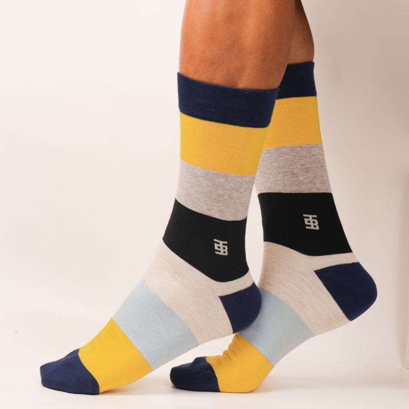 Step into golden elegance with Sunset Boulevard. Inspired by dusky horizons and city lights, these socks blend bold yellow, navy, and soft grey tones for a look that’s timeless yet fresh.